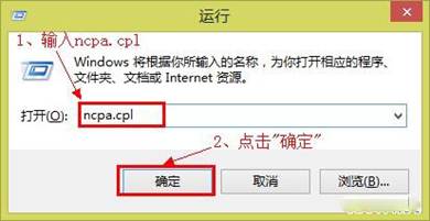 2、在运行程序里面输入ncpa.cpl—>点击”确定”(或者按键盘上面的回车键)